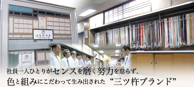 きもの姿を最後にきめる帯締(おびじめ)、帯揚(おびあげ)。それだけに妥協は許されません。渡敬(わたけい)は、「組紐文化」の一端を担うと企業として、お客様に最適な帯締めの「組み」と「色」にこだわり続け、三ツ杵印というブランドを大切にしながら、三代目になりました。